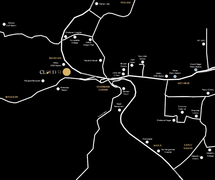 Central Bavdhan is a prime location for homebuyers in Pune West, boasting 176 residential projects. Key landmarks near Oree - Cloud 51 include Aditya Shagun Mall, NH 48, and Ebix Technologies. With essential amenities and facilities nearby, Central Bavdhan is an ideal and convenient place to call home.